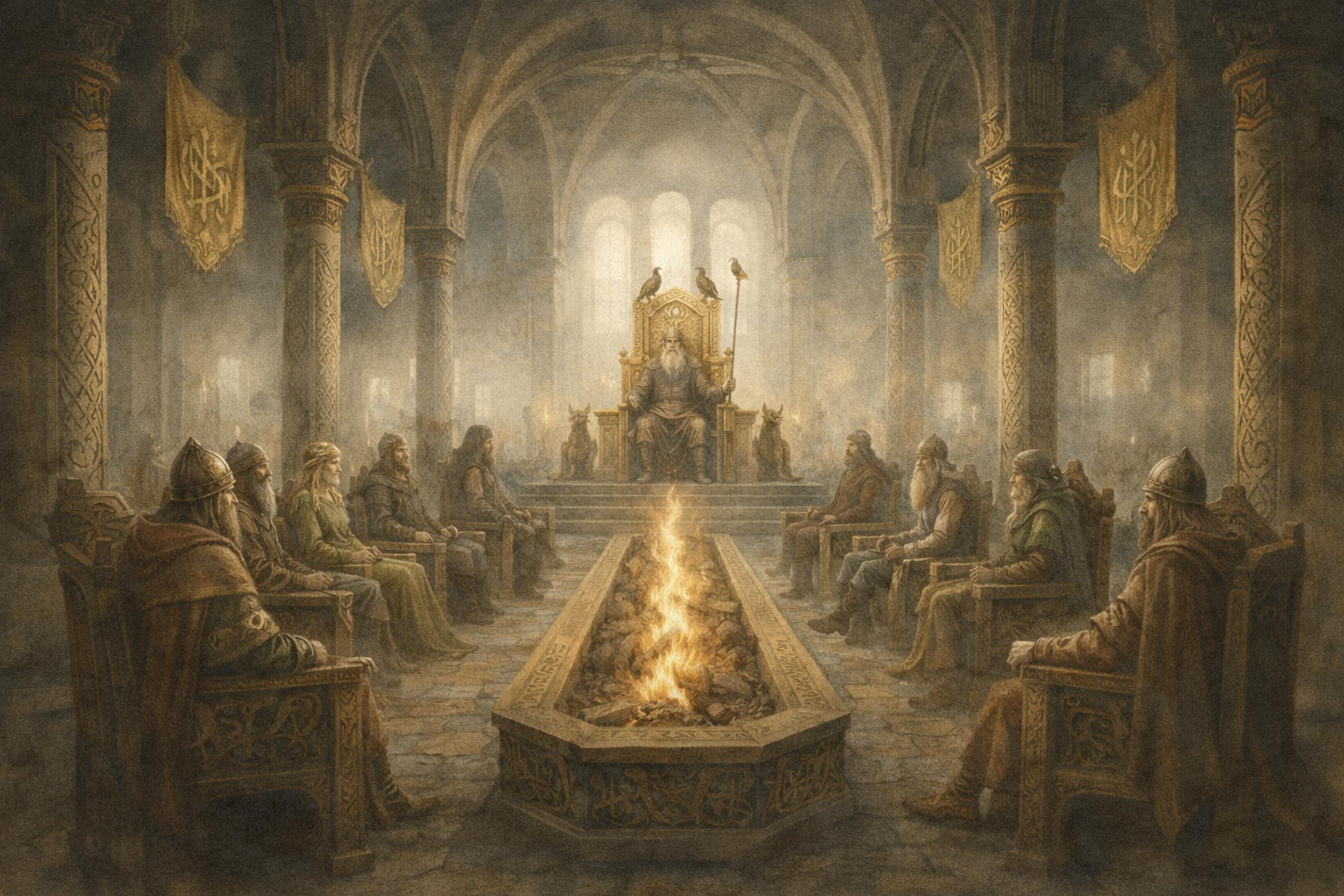 El palacio de Frigg, rodeado de nieblas sagradas. Asociado al silencio, la intimidad y el conocimiento del destino. Es el lugar donde Frigg teje el porvenir y custodia secretos que ni siquiera Odín domina plenamente.